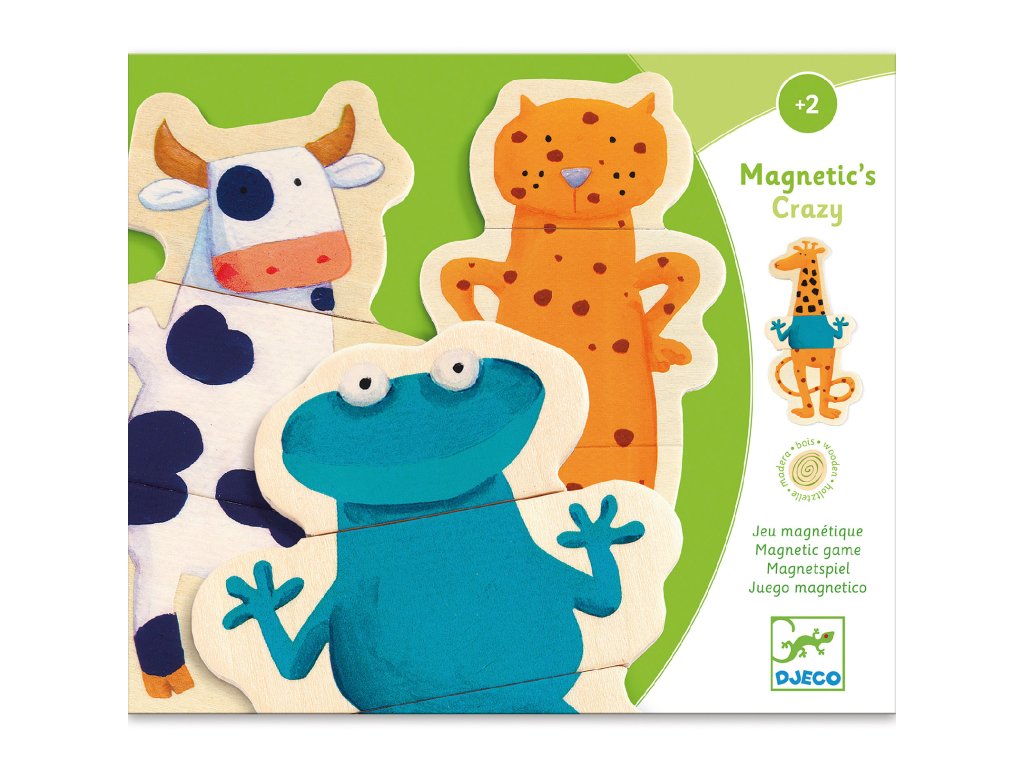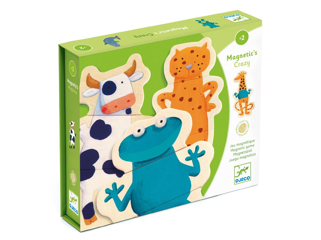 Drevené magnetky Bláznivé zvieratká sú hravá magnetická skladačka, v ktorej si deti poskladajú zvieratká z 3 dielikov – hlavy, tela a nôh. Najprv môžu skladať „správne“ zvieratá, no najväčšia zábava začína vtedy, keď dieliky začnú miešať a kombinovať a vytvárať vlastné fantazijné tvory.