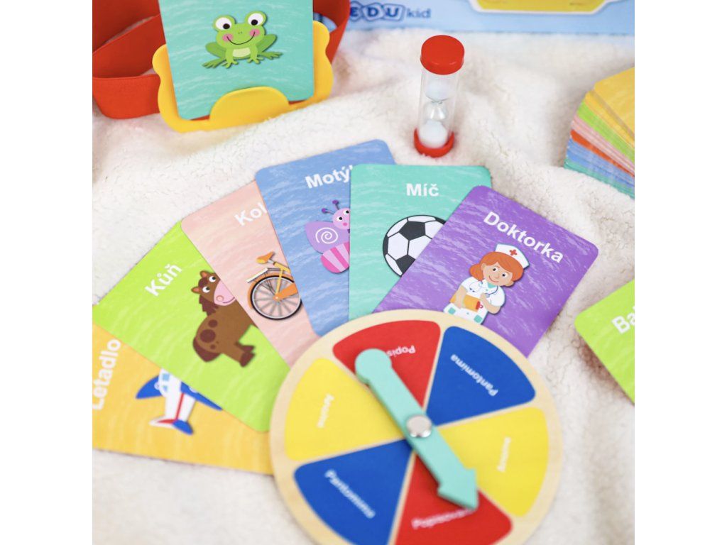 Zábavná rodinná hra Hádej, kdo jsem! obsahuje 60 kariet so zvieratkami a predmetmi, presýpacie hodinky a bodovacie hviezdičky. Pomocou pantomímy, otázok alebo opisovania deti rozvíjajú slovnú zásobu a komunikačné schopnosti v českom jazyku.